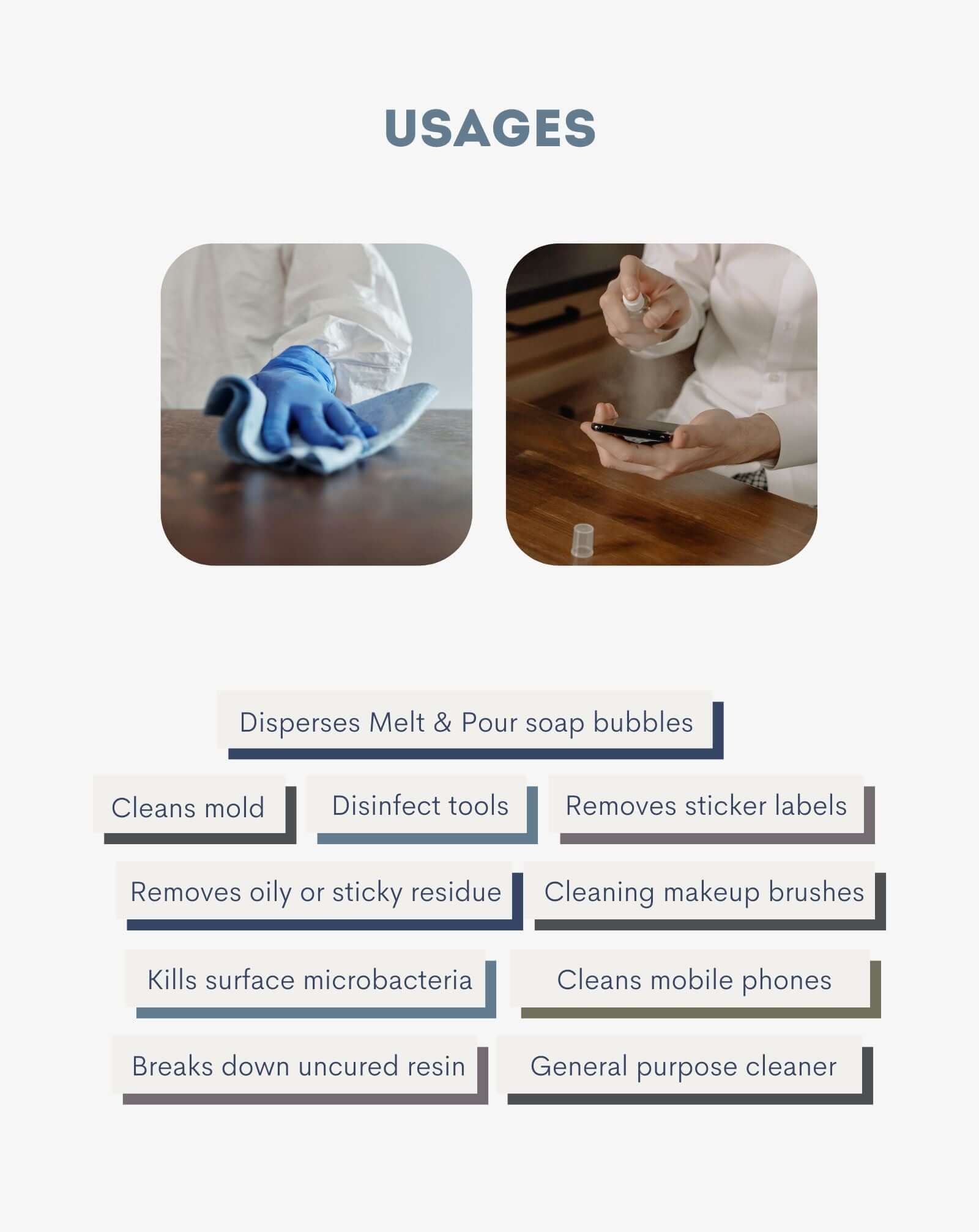 This concentration of Isopropyl Alcohol is perfect for dispersing bubbles on the surface of melted Melt & Pour Soap, and to break down uncured resin for easier clean-up. You can dilute it with distilled water or use it as it is to clean and disinfect molds, packaging and tools.