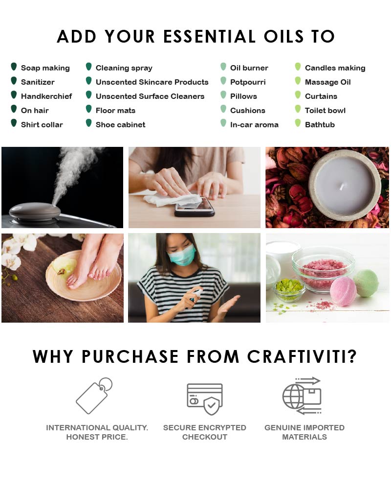 Essential oils are concentrated plant essences derived from parts of plants. Craftiviti's Essential Oil range is never diluted or adulterated. It is 100% pure essential oil of the finest grade for your well-being and your family.