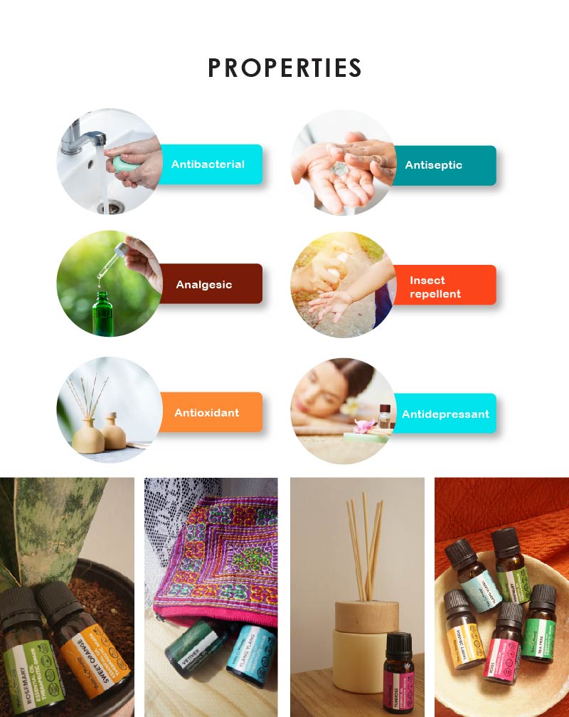 - Campurkan minyak pati (Essential Oil) sebanyak 10 hingga 20 titis ke dalam 30ml minyak pembawa sebelum digunakan.