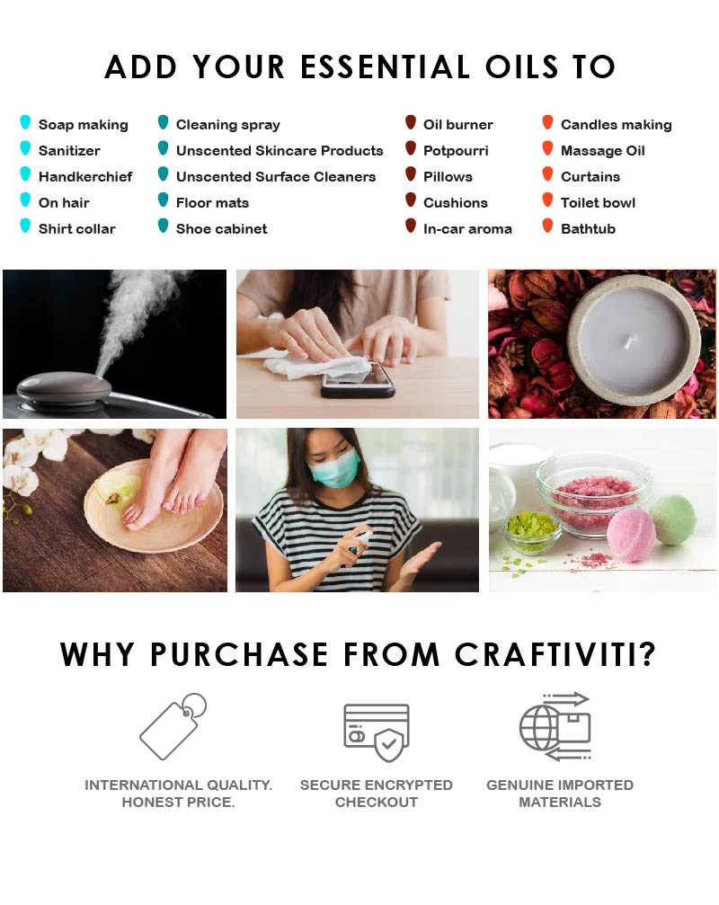 Essential oils are concentrated plant essences derived from the leaves, flowers, stems, roots or other parts of plants. Craftiviti's Essential Oil range is never diluted or adulterated. It is 100% pure essential oil of the finest grade for your well-being and your family.